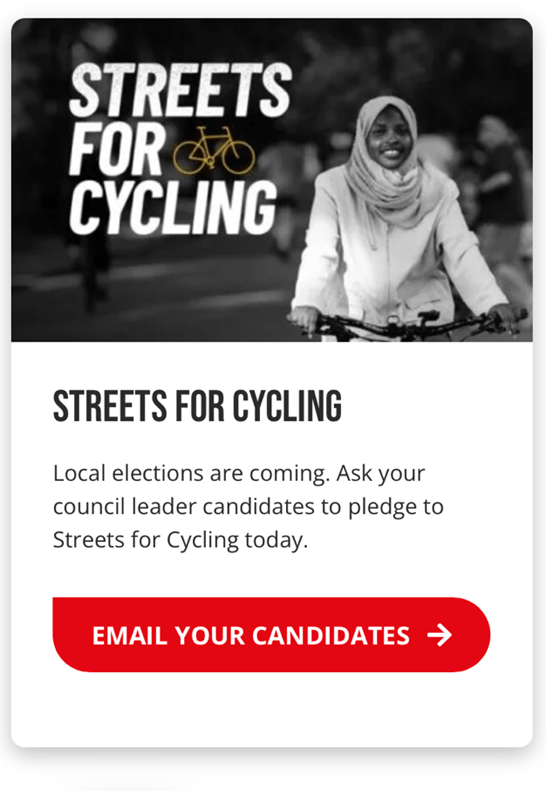 We have just emailed each of the main parties or, if we know who they are, the local leaders of these parties, to ask them to pledge their support for Streets for Cycling.