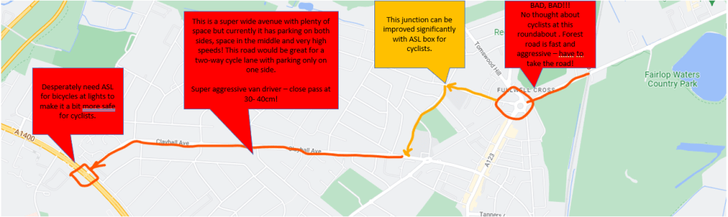 Overview: Only super confident and skilled cyclists will take this section on. High speed, close pass and zero infrastucture. However, there are some small improvements that can be done like ASL boxes at lights to help cyclists filter to the lights and safely take off. Clayhall Avenue has a lot of space that can combine a cycling lane and parking but instead it is fully car-centric. This section connects Fairlop Waters Country Park and South Woodford and desperately needs more attention.