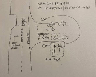 When we met, we saw cars cutting the corner of Riverdene Road/Britannia Road. Drivers followed a line exactly where cyclists riding from Ilford Lane would be (between 75 and 100cm from the kerb). And that is before Britannia Road is made one-way. Once it is, drivers turning the corner of Riverdene Road/Britannia Road will expect a clear run and the temptation to cut the corner will be greater. And we know that they will be travelling faster.