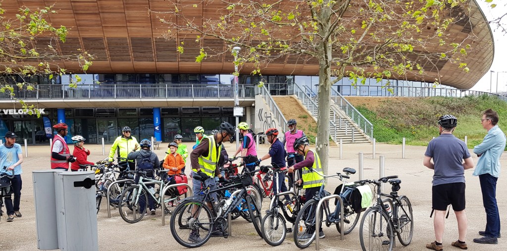 In the respite between storms Babet and Ciaran, ten intrepid cyclists gathered in Wanstead Park for Redbridge Cycling Campaign’s last family ride of 2023. Our outward route took us to the Olympic velodrome, where novice track riders were being briefed for a taster session, then onward to the heart of the Queen Elizabeth Olympic Park, where we took the break in front of the stadium by the fountains.
