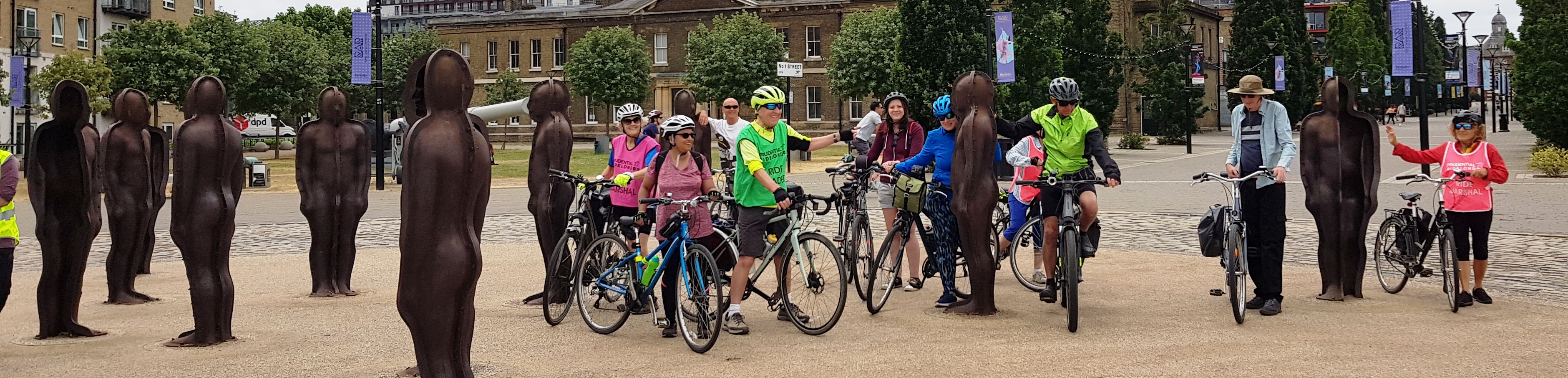 Twelve intrepid riders set off towards the Royal Docks intending to cross the Thames at North Woolwich. We knew the Woolwich Ferry wasn’t running on Sunday, and the lifts in the Woolwich foot tunnel were out of action, but we had a contingency plan – to take our bikes across on the DLR. Having made it to Woolwich, we cycled the path south of the river, admiring the art works around the periphery of the