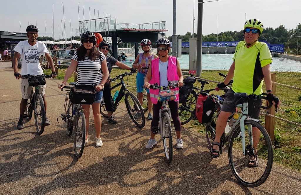 Seven star riders, including three marshals, left Wanstead Park determined to make it to the Lea Valley White Water Centre on one of the hottest days of this summer’s late heatwave. The first leg went through Leytonstone and Walthamstow Marshes to Markfield Park. Some of our family rides finish here, but today there was no time to visit the Victorian double-expansion beam engine, we had much further to go, along towpaths, following part of national cycle route 1, until at last our end was in sight: the canoeing centre near Waltham Abbey built for the 2012 Olympic white water rafting.