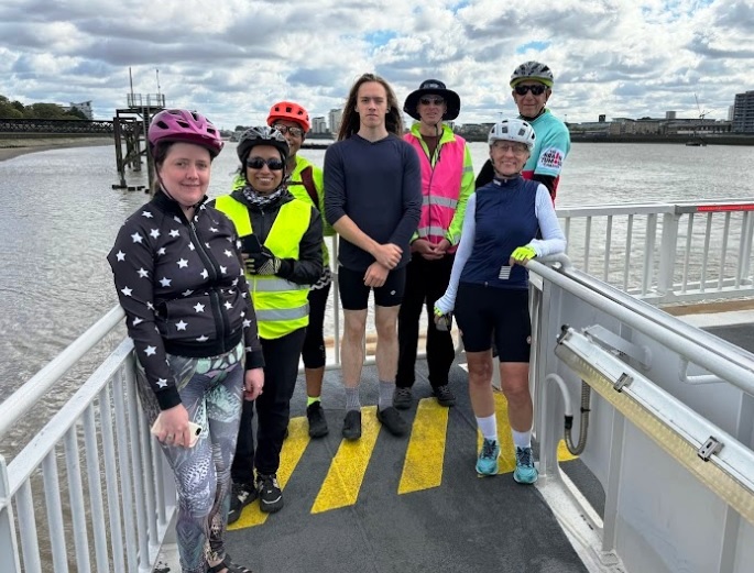 The sun accompanied us all on a great ride down to Woolwich. TfL managed to challenge us. The Woolwich Ferry was not operating, the DLR was not operating and both lifts at the Woolwich tunnel were out of service. This sturdy bunch of cyclists were not to be defeated and, with the help of an additional strong man, all bikes were safely carried down into the foot tunnel and up the other side. We then enjoyed the southern path past the Thames Barrier, under the cable car and around the O2 dome.