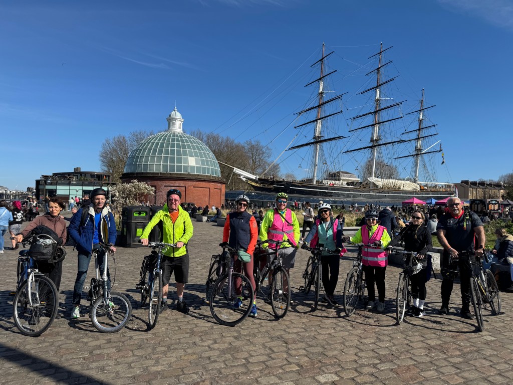 8 riders left Wanstead Park in sunshine and headed down to the Thames at Woolwich. We enjoyed our free ‘cruise’ across the Thames before following the path along the south bank. We passed the Thames Barrier, the cable car crossing from Silvertown and the Millennium Dome before reaching Greenwich. After passing Greenwich Palace we stopped near the Cutty Sark for a lunch break.